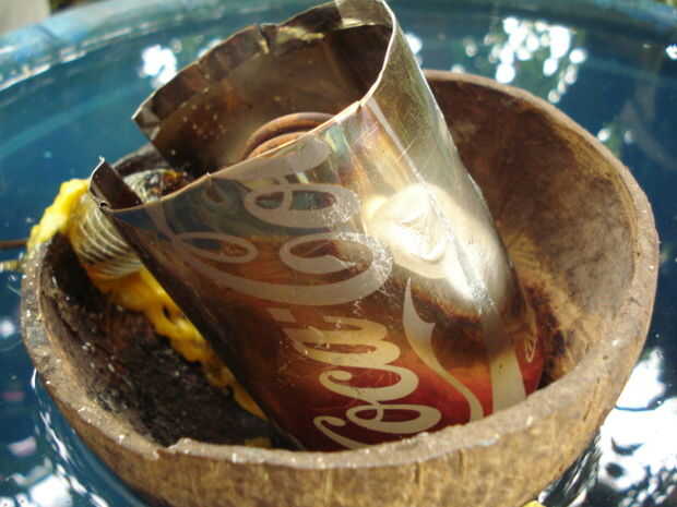 7. en otros lugares, colocar los pequeños grumos de carbón en la lata de Coca Cola y encenderlos.
