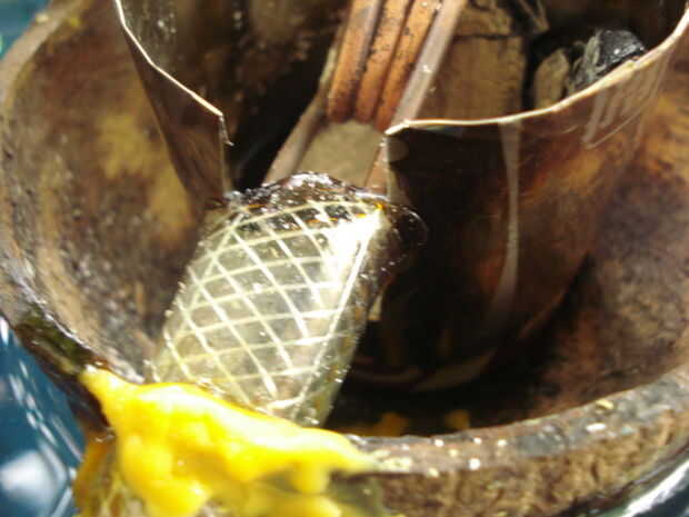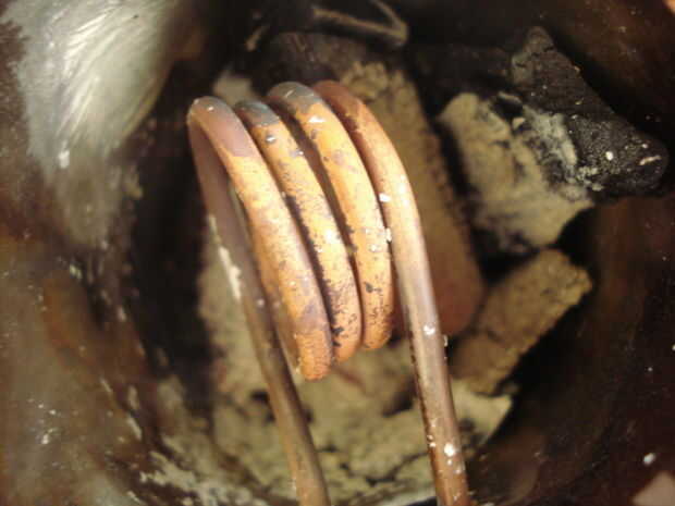 6. punta de la embarcación, tomar un trago de agua y soplo/empuje lo en el tubo de cobre - Asegúrese de que no esté aire en la bobina o el tubo, luego introduzca el coco en el agua, manteniendo los dedos sobre los extremos de la tubería. Los extremos del tubo deben permanecer bajo el agua y el tubo no debe contener aire.