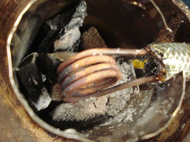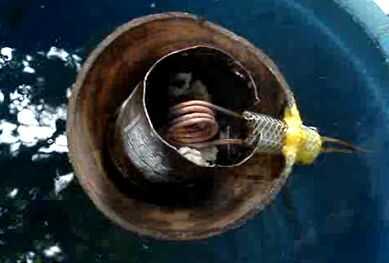 8. usando las pinzas, colocar la lata de Coca Cola debajo de la bobina en el coco - pasa a la bobina de tubos de salida a través de la ranura en el poder.