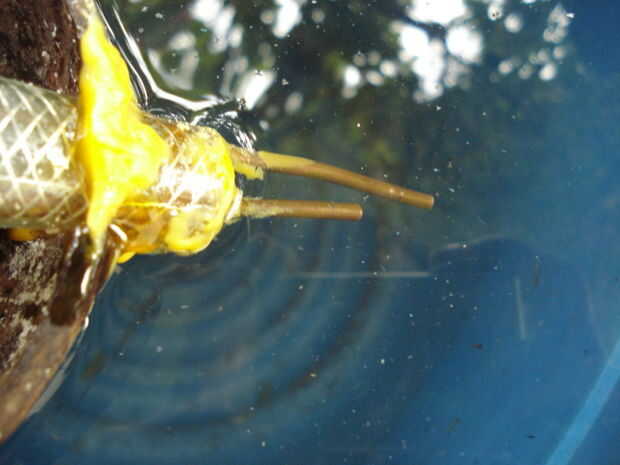 5. alimentación de los extremos de la tubería de la bobina a través de 2" de manguera de jardín, luego empuje la manguera dentro de la ranura en la pared de coco - sellar los huecos con goteo de cera de vela. También sello enchufe final del agua de la manguera con cera de vela de la misma manera.