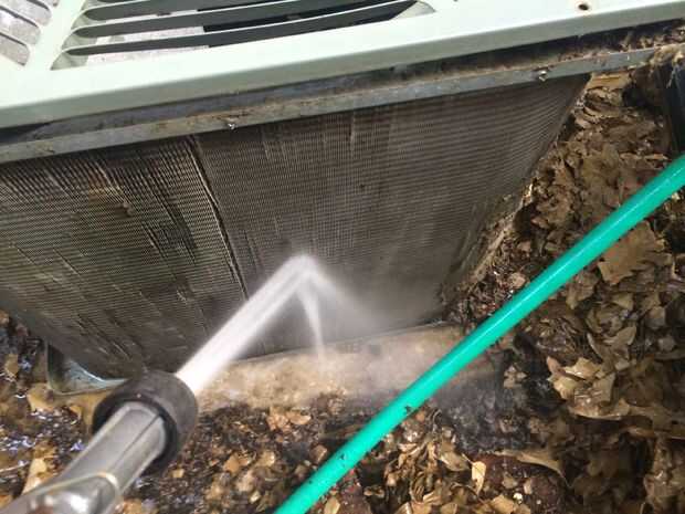 Utilizando una manguera de jardín con aerosol bajo/sin presión exterior para quitar la acumulación de polvo, suciedad, hojas y todo lo que está atascado en el lado. Las unidades en la foto son ejemplos extremos de acumulación. Mucho menos acumulación aún puede causar problemas en la refrigeración. Empezar por el exterior en un ángulo de rociadura y la acumulación se desprenderá en forma de 'Peeling'. Luego terminar rociando de adentro hacia afuera para limpiar la suciedad pegada en las aletas. (Cuando la acumulación es alta las aletas no permiten suficiente agua pasar para efectivamente limpiar el exterior sin primera pulverización exterior) Mientras la unidad está abierta Limpie cualquier suciedad que ha acumulado en la parte inferior de la unidad. Continuar rociando alrededor hasta que la unidad aparezca limpiarla. Use una presión muy baja para no doblar las aletas, sólo que debe hacer un extremo de la manguera abierta.