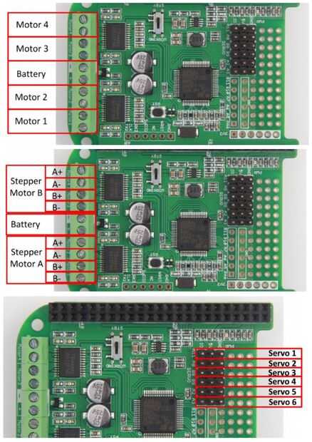 Como se muestra en la imagen, el cabo del puente de Motor tiene una capacidad fuerte de motores. Es muy apropiado hacer una automatización de dispositivos tales como robots con él.
