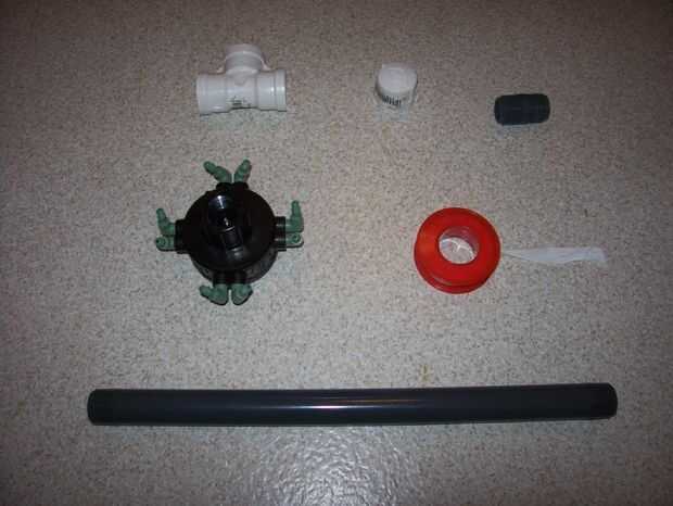 Para hacer el sistema de dióxido de carbono, conectar un colector de sistema de riego de ocho puertos a un tubo largo de PVC de una pulgada. Para obtener buenas juntas, utilice Teflon cinta a cinta las roscas antes de colocar las piezas juntas. A continuación, conecte el tubo de una pulgada a un conector en T. Bloquear uno de los extremos del conector en T y conecte el otro extremo a un tubo de PVC largo de pie.
