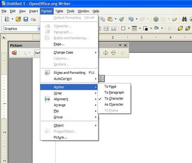 Usar OpenOffice.org Writer 3.1.0.  Ancla la imagen a un personaje.