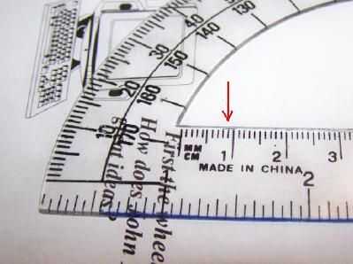 El espacio en blanco por encima de la imagen y el texto debe ser igual en todas las cuatro notas al corte de una hoja.  Mida desde la parte superior del texto hasta el borde del papel en el conjunto superior de imagen y texto.  La medida de mi configuración era 9 milímetros.  Mide 9 mm de la parte superior del texto en el juego de fondo y haga una marca cero con un punto del cuchillo.  Ver la flecha roja.
