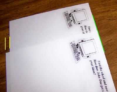 Cortar el papel en dos en la marca cero.  El espacio en blanco por encima de las imágenes y texto sobre cada porción de la hoja es igual.  Ver la línea verde.  Los bordes inferiores son desiguales.  Ver las líneas amarillas.  Esto será corregido en el siguiente paso.