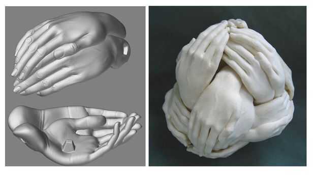 Una gama de efectos diferentes se puede lograr a través de variaciones en la técnica que describo en este tutorial. Un ejemplo posible sería crear texto en relieve en prácticamente cualquier superficie, como se muestra en la imagen de arriba. Para este tutorial restado un 3d análisis de un modelo digital, pero es también posible restar un modelo en 3d de sí mismo, creando una impresión 3d puede mosaico o teselado. Un ejemplo de esto se muestra en la segunda imagen de arriba, he creado una mano impresa 3d que encaja perfectamente en copias de sí mismo, por lo que una vez que se duplica (en este caso a través de un molde de silicón) pueden ser reforzada en forma de esfera.