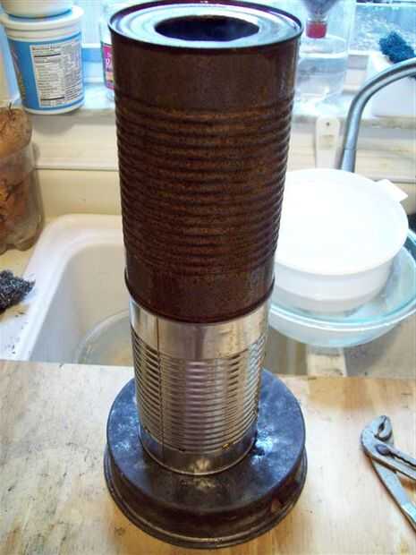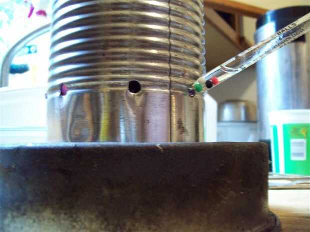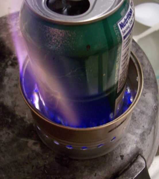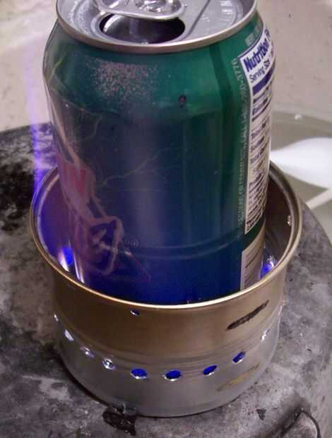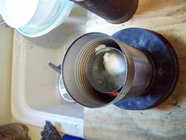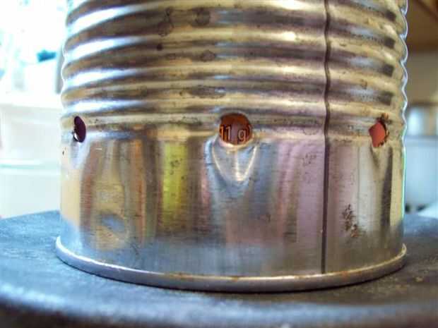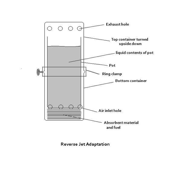 Esta adaptación es menos susceptible a intrusiones de agua y el viento cuando se perforan agujeros de escape en la parte inferior de otro recipiente colocado boca abajo con el fin de incluir el pote y el combustible.
