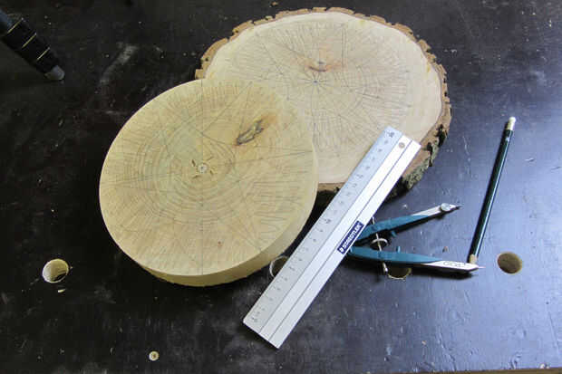 Usé mi compás para dibujar un patrón más o menos complejo en las palmadas para crear las más grandes piezas de triángulos de adentro hacia afuera. El ángulo acentuado tiene que ser de 30° para que 12 de ellos crear un círculo. Una sola pieza para cada hora.