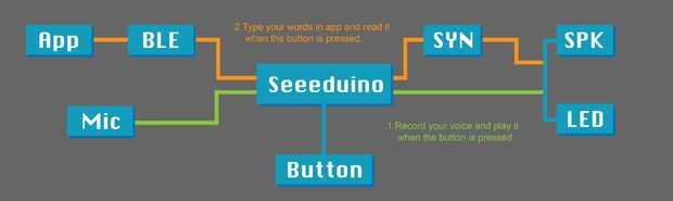 Todo lo que necesitas es un Seeeduino, una abeja de buletooth, un micrófono, un botón juego arcade, un altavoz, una pieza del módulo de síntesis de discurso (syn6658), un trozo de tira de LED RGB y un adaptador de alimentación de 12V.