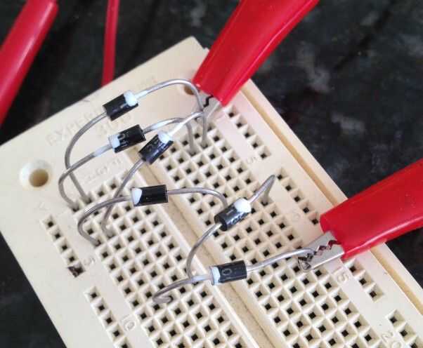 Ver la tercera foto. Mi diodos han rodando alrededor en una bandeja de plástico para unos cuantos años. La banda que indica polaridad está casi desaparecida. Usé la función de prueba de diodo en el multímetro para identificar la polaridad de los diodos. Utilicé el esmalte de uñas blanco para marcar para mi propio beneficio. La placa fue de gran ayuda para conseguir este experimento creado derecho.