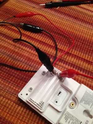 Quería estar seguro de que mi cargador de teléfono modificado alimentación del transmisor. Conecté los cables puente de cable del altavoz a los terminales de entrada en el transmisor. Preste atención a dónde sería la punta de la batería y donde sería el extremo despuntado de la batería, o tienen la polaridad invertida y el transmisor no funcionará.