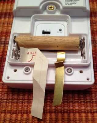 La foto muestra otra tira de papel para el dimensionamiento de la segunda tira de latón. La primera tira de latón está en su lugar y firmemente sostenida por la forma ficticia de batería pasador. Estas tiras de latón fino me permitirá funcionar con los conductores hacia el exterior del transmisor sin masticar una parte de la caja del tamaño de un cable de altavoz.