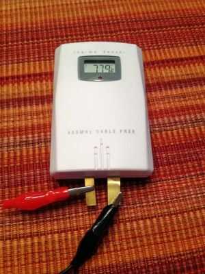 Conecté los cables de puente a las tiras de latón y a los conductores para el cargador de teléfono con los diodos añadidos. La franja más amplia es el lado negativo (-). El transmisor funciona. Después de reiniciar el transmisor y la unidad de visualización, todo funcionaba como debería.