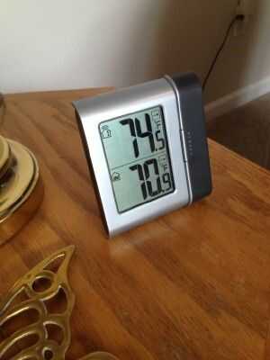 La lectura exterior es mayor que el interior de la lectura porque el transmisor no está todavía montado en el exterior de la casa. Más bien, es en una mesa de comedor bajo algunas luces incandescentes donde he estado trabajando en este proyecto. Lo que queda por hacer es ejecutar el cable del altavoz a través de la grieta en la puerta de lado y grapa cuidadosamente en su lugar. Entonces necesito para montar el transmisor bajo el alero de la casa y de la soldadura de los extremos del cable del altavoz a las tiras de latón. Necesito presionar el reset en ambas unidades y entonces todo debería estar bien. (Si perdemos energía a nuestra casa, necesitaré seguir el proceso de reset otra vez).