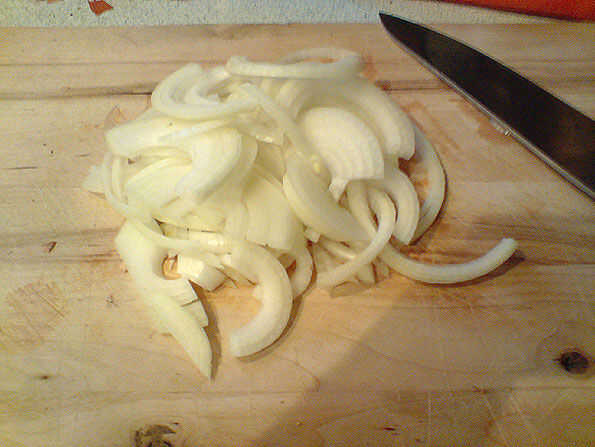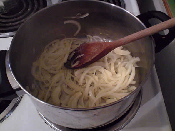Freír la cebolla en rodajas en aceite de oliva y 1/2 la mantequilla (el aceite deja la mantequilla de la quema).
