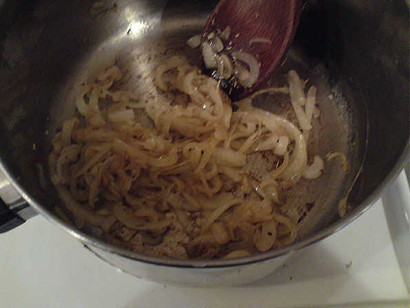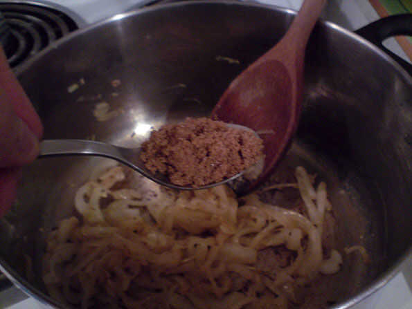 Freír la cebolla hasta que empiece a dorarse añadir 1 cucharadita de azúcar morena y revuelva.