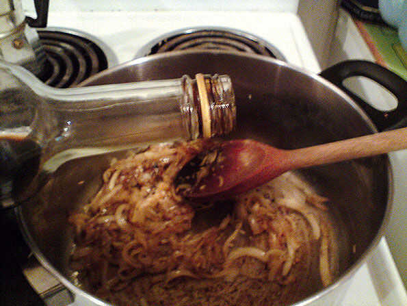 Añadir 4 cucharadas de vinagre balsámico y reducir hasta que queden espesas y jarabe como.