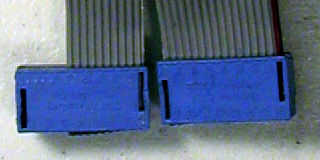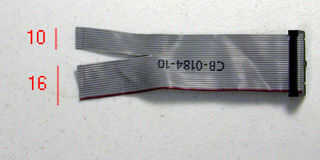 No he podido encontrar un conector crimpable de DIP de 26 pines, usé dos 16 pines conectores DIP. Tomar el cable de cinta y contar cuidadosamente 16 pernos desde el lado de la clavija 1 del cable. Pin 1 debe ser marcado con un color diferente (generalmente rojo). Utilice un cuchillo para dividir el cable de cinta para un par de pulgadas. Vas a tener una cinta de 16 pines y 10 pines cinta.