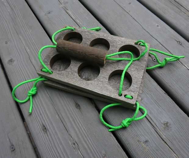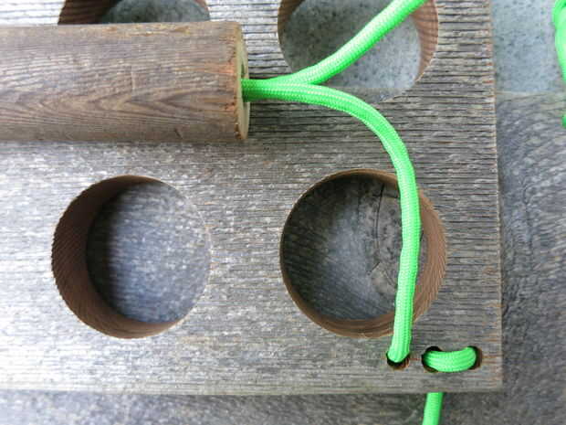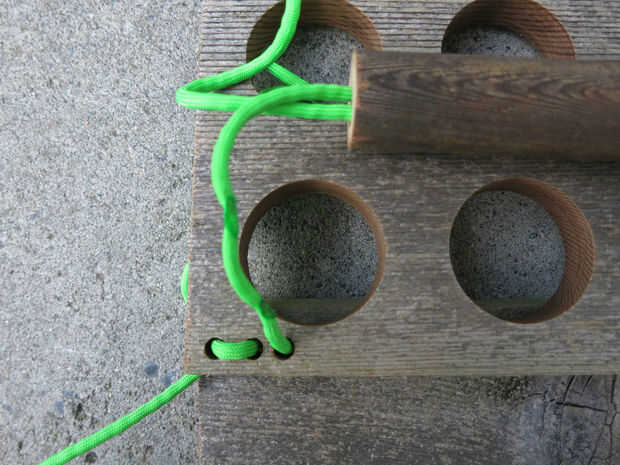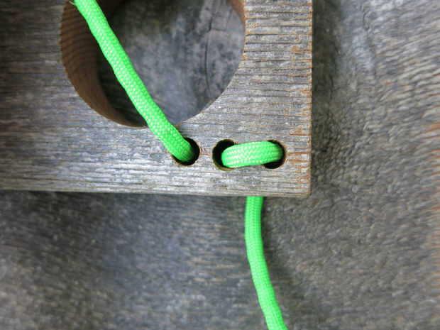 -El paracord a través del mango de la alimentación, entonces pienso que a través de los tres agujeros en el otro extremo del borde 8", a partir desde el interior de los tres agujeros (imágenes 3 y 4).