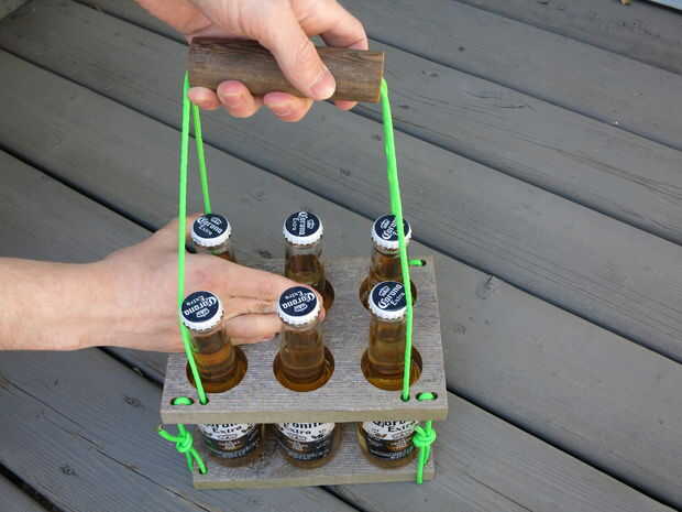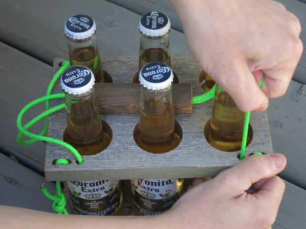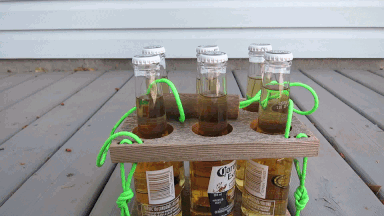 -Coloque la cerveza en la base, con los cuellos de las botellas que se pega para arriba por los agujeros de la pieza superior.
