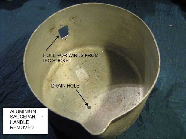 Comencé por los remaches de perforación y retirar la manija de la cacerola. Un agujero de aprox. 25 x 15 mm fue cortado para el cableado en la cinta de calefacción y se perforó un orificio de drenaje de 4 mm de diámetro en la parte inferior.