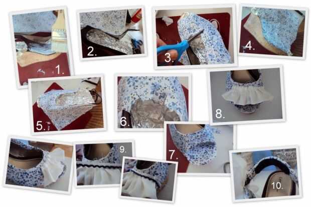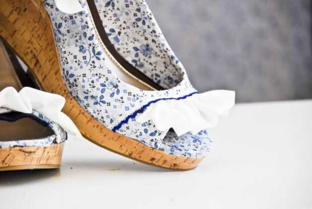 1. cepillo mod podge uniformemente con un medio tamaño de pincel en el dril de algodón del zapato. 2. -4. Coloque a la tela en el zapato y trace el borde, donde el denim golpea la cuña. Corte a lo largo de su traza. Comenzar pegando la tela de la parte inferior hasta la parte superior. El pegamento a medida que avanza. 5. cortar la tela en la parte superior, debes de adivinar la forma. Más adelante se puede ajustar. 6. hacer pequeños cortes en las curvas, por lo que la tela no tiene pliegues. 7. Corte la tela por la mirilla, pega en el zapato. 8. cortar un trozo de tela blanco 2 pulgadas, dóblalo a la mitad y coser un volante.