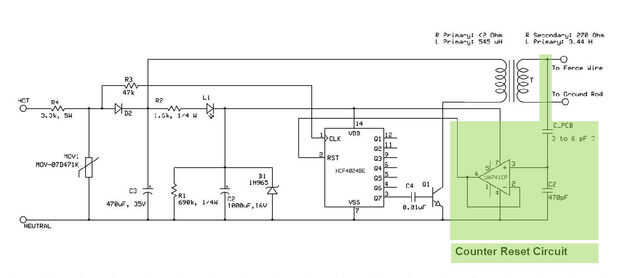 El pulso de reset se deriva realmente de la salida de alto voltaje en el lado secundario del transformador. Condensador C2, junto con una pequeña capacitancia formada por áreas de cobre PCB en lados opuestos del tablero de un divisor del voltaje del condensador. El pulso de reset establece el contador a cero, por lo que el ciclo puede comenzar otra vez. El amplificador operacional está configurado como un buffer de ganancia unidad y se utiliza para amortiguar la señal desde el divisor de voltaje a la entrada reset del contador.