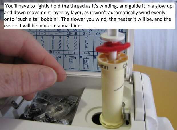Paso 7: Con velocidad lenta, guíe el hilo con los dedos suavemente y uniformemente en el carrete giratorio.