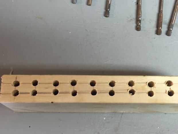 2 hacer líneas horizontales en el borde superior. En cada línea haga líneas verticales y pulgada de distancia. Perfore un agujero donde se intersectan las líneas. Tenga cuidado de no perforar a través el 2 x 4.
