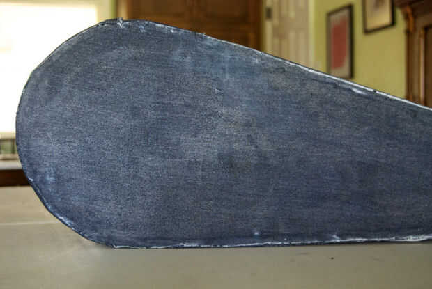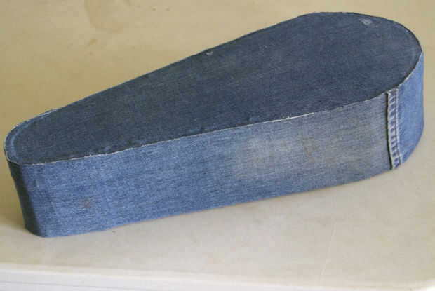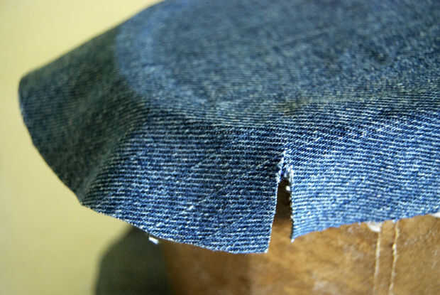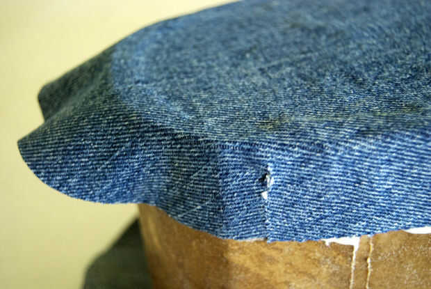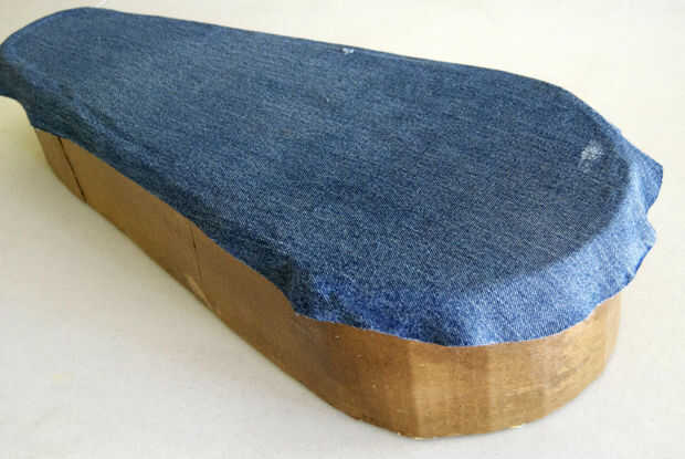 Pegamento blanco y un pincel de espuma son buenos para la fijación de la cubierta. Me había pegado arriba en primera, luego cortar muescas alrededor de las porciones curvas y encolarlos después de la colocación. Por último, pegue una pieza para cubrir los lados y recortar para ajustarse. El mismo cortador de caja que se utilizó para cortar el cartón realmente funciona bastante bien para la tela de corte, también. Sólo ejecutarlo cuidadosamente a lo largo de la parte superior de la caja, afeitado apagado cualquier exceso altura.