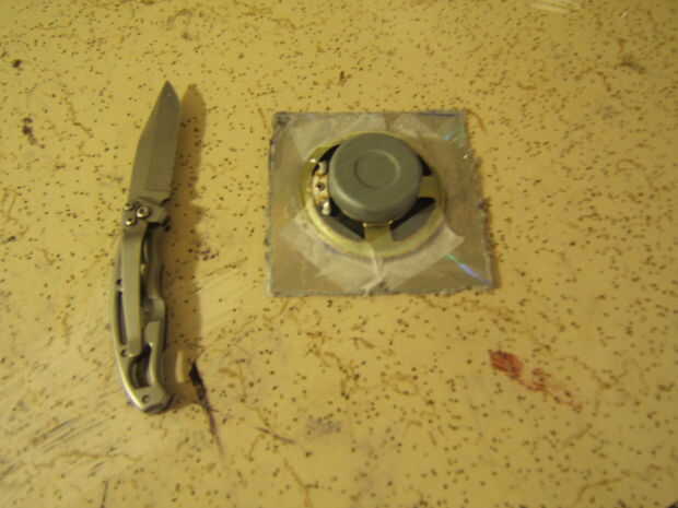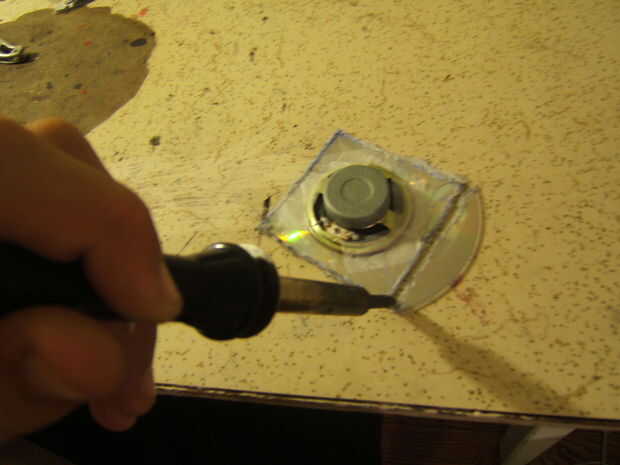 Corte el CD para el cuadrado o la forma deseada con el cuchillo de bolsillo (y excepto los bordes), aunque puede usar el soldador para quemar a través de él y que es lo que hice después de varios intentos. Ahora utilice el cuchillo de bolsillo para limpiar los bordes.