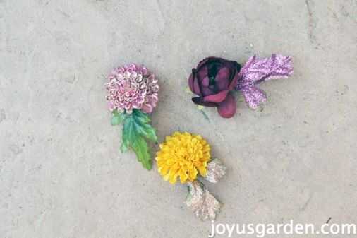 Sacó las cabezas de flores de los tallos y había pegado una hoja en la parte posterior de cada uno. como se puede ver, algunas de las hojas y las flores cayeron en el bote de brillo.