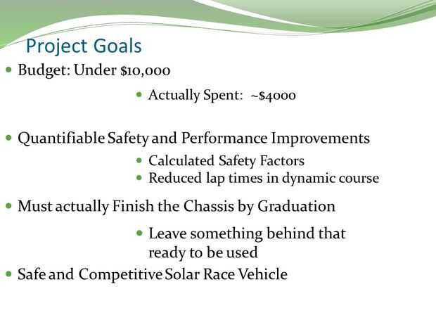 Cumplir con las normas: Hemos diseñado el coche para cumplir con las normas de la American Solar Challenge Race. Un documento de 27 páginas lista cosas como: conductor debe estar en posición vertical en no menos de 27 grados. Conductor debe tener no menos de 10" de espacio entre cualquier parte de su cuerpo y el marco. Las dimensiones del vehículo no deben exceder X'. Debe haber espacio adecuado crush, visibilidad y así sucesivamente.