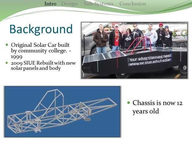 Limitaciones prácticas: El coche tenía que ser capaz de caber a través de una puerta doble estándar, por lo que lo podríamos conseguir en acerca de los edificios. Las ruedas fueron fuertemente reguladas por las organizaciones de la raza y eran tan caros para comprar nuevo que no tuvimos ninguna opción pero para robar las ruedas existentes del antiguo auto solar. El vehículo tuvo que ser alimentado por un solo motor de eléctrico muy especial de alta eficiencia diseñado para montar a una de esas ruedas.