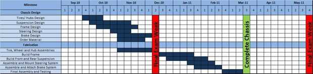 Línea de tiempo: Teníamos que terminar realmente el nuevo chasis en el momento en que se graduó, lo contrario sería poco probable que alguien más podría saltar y terminar nuestro trabajo. Ver el anterior diagrama de Gantt. La línea de tiempo real resultada para ser todo lo cambiado de puesto y aplastado a la derecha porque estábamos todos ocupados a tiempo completo los estudiantes.