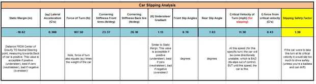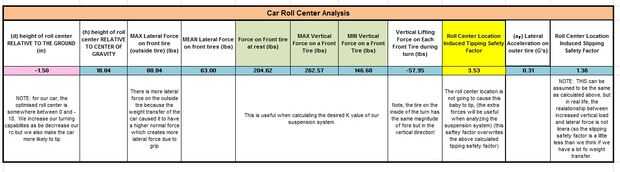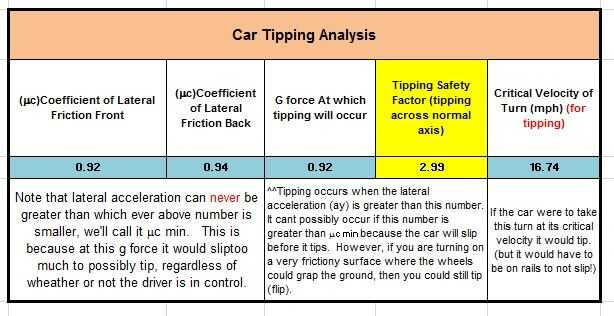 A partir de ahí he encontrado la velocidad máxima que del coche posiblemente podría tomar la vuelta sin deslizamiento o vuelco. Entonces me aseguré de que el factor de seguridad para una condición de deslizamiento es menor que para una condición de la punta, asegurando que el coche nunca podrían inclinar (a menos que usted golpeó un bache).