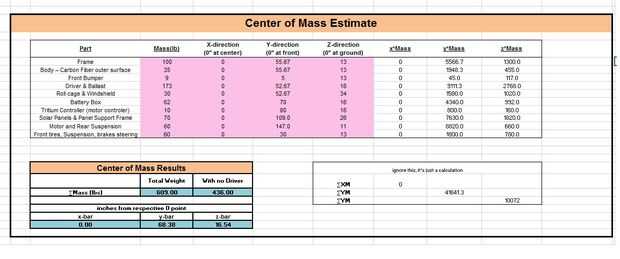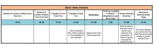 Empecé haciendo referencia al arte de concepto Microsoft Paint en el paso de la "concepción". Me permitió estimar algunos números razonables para las dimensiones del coche y las ubicaciones de todo. Esto me permitió hacer un análisis estático del vehículo (todo en papel) para determinar su distribución de peso en cada neumático, así como su centro de masa.