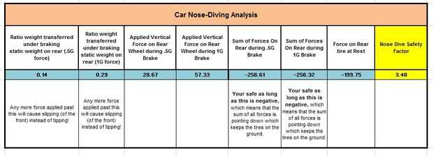 Hice algo similar para el análisis de buceo de nariz para asegurarse de si las ruedas delanteras trabaron para arriba que el coche patinar a un alto en el lugar de los bancos sobre los neumáticos delanteros. Esto resultó para ser un problema insignificante porque nuestro vehículo era tan de largo.