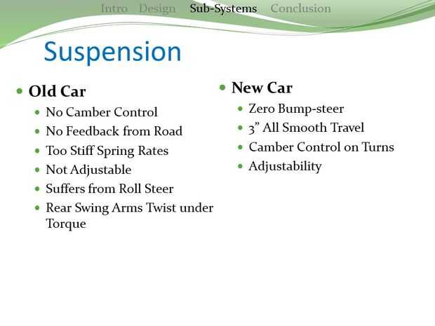 - Reducir al mínimo el peso general del sistema de suspensión en relación con el resto del coche (mantener una relación de bajo peso soltado/sin muelles)