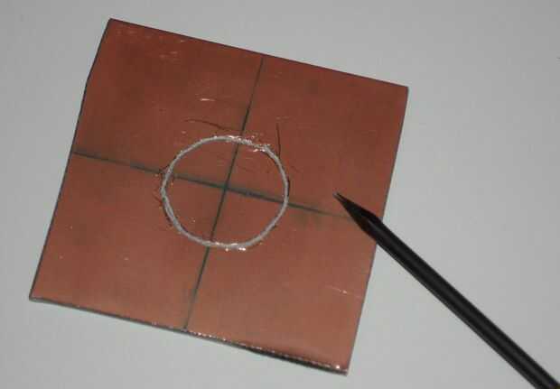 Entonces, raspar hacia fuera el círculo dibujado para crear dos áreas separadas (el área media es para nuestra conexión a tierra eléctrica y el área exterior es para Vcc)