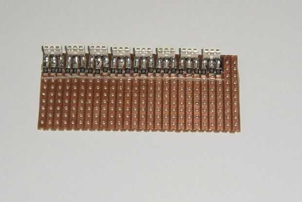 Una vez hecho esto, obtener una longitud de cable sin aislamiento y soldadura a lo largo de la longitud de los cátodos de los LED. a continuación, soldadura para la veroboard (esta será nuestra conexión a tierra) - ver segunda foto
