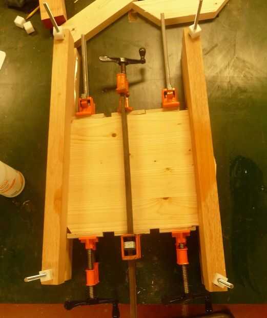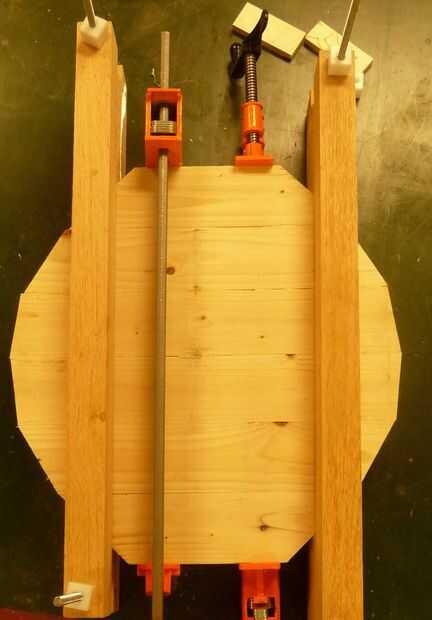 Sacrificios de sujeción y las abrazaderas se utilizan para unir las cuatro piezas del medianas. Después de una hora, pegar las dos piezas exteriores. Darle un par de horas y luego de plano o grueso arena el pedazo grande 1-1/4" de espesor. Al mismo tiempo que arena o plano esta en blanco, también plano un trozo de 2 x 4, por lo menos 20" de largo, por lo que es del mismo grosor exacto. Este desecho se utilizará para hacer un ángulo de calibre. Ahora tienes un espacio en blanco del tazón de fuente grande.