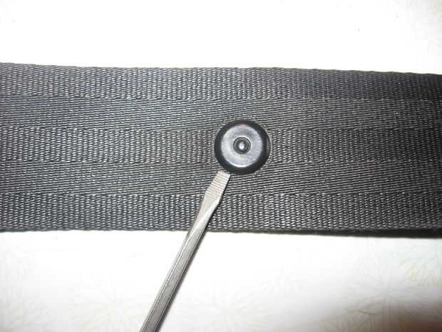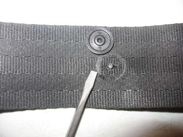 Sólo cogí un estándar pequeña o plana, destornillador, coloqué en el borde, cuidando de no dañar las correas de mi cinturón de seguridad. Estallar con sólo un giro de la manija. No hay ningún agujero, había sido instalado empujando las fibras separadas. Bastante fácil realmente.