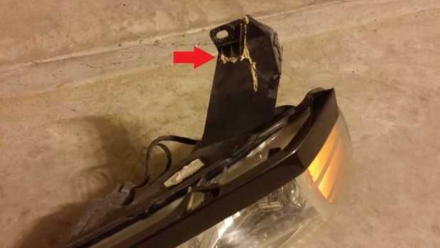 Durante la instalación de la linterna me di cuenta de una grieta en la carcasa de plástico. Aplica pegamento a la sección agrietada y me esperó para que la curación. Apliqué otro pegamento fuerte sobre las grietas para medida adicional. (El segundo adhesivo probablemente no era necesario, pero no quiero el craqueo a seguir de las vibraciones al conducir). Instalar los faros en posición con los tres tornillos y vuelva a conectar la conexión de faros eléctricos. Vuelva a instalar la rejilla en las seis localidades de la lengüeta de plástico, como se muestra en el paso 3. Luego cierre el capó del vehículo.
