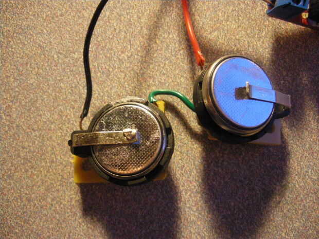 (2) la fuente de alimentación de Arduino es proporcionada por dos pilas de botón CR2032. Siempre y cuando estén cargadas debe proporcionar una fuente de alimentación estable. Sin embargo, como destino, algunos de mis células del botón de espacio no están todos en 6 voltios y agregar una celda de botón extra para conseguir el Arduino para que funcione correctamente. En cuanto a la construcción real es simple; el portapilas se sueldan junto con un cable entre el ánodo y el cátodo. PERO hay algo a tener en cuenta: Si usted compra el portapilas de Radioshack como lo hago, entonces la polaridad marcada en los titulares está mal (o por lo menos es para este proyecto). Esto es porque las pilas van en el soporte pero no estén sentadas correctamente, lo que los hace propensos a caer en el golpe más leve (y esto obviamente no se adapte bien para un ambiente de vibración de la abundancia). Sólo pretende positivo es negativo y viceversa y para mayor protección contra vibraciones, tomé algunos cinta aislante y envuelto firmemente e individualmente por cada titular.