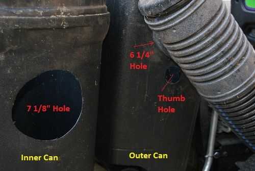 Use un fieltro con punta de pluma para marcar el alrededor interior exterior puede tubo stub. Esto Ubique donde cortar una abertura circular en el segundo (interior) bote de basura. Quitar el interior puede y marca un círculo de 7 1/8" centrado en el círculo que acaba de trazar. Orificio por el lado de la lata interna (Foto #1).