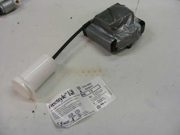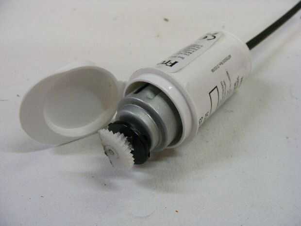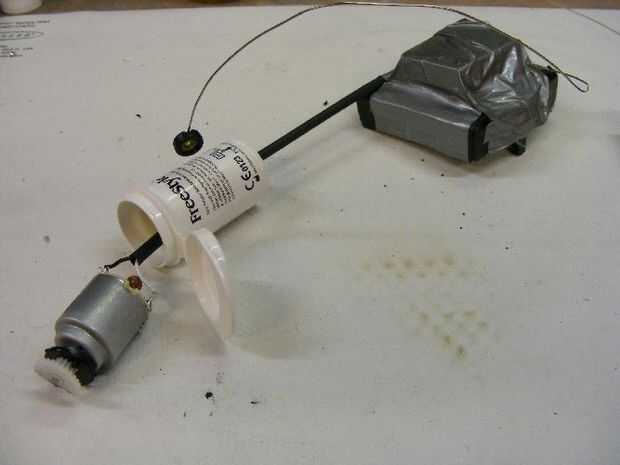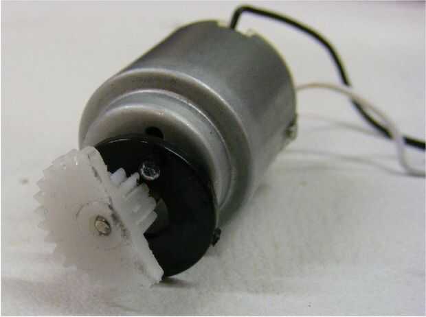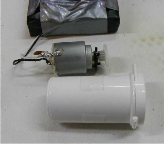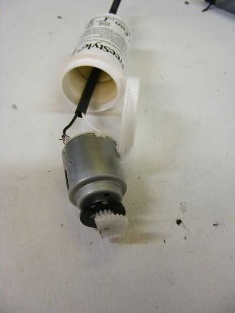Después de asegurarse el motor caben holgadamente en una carcasa del motor. Perfore un agujero en la parte inferior de la cubierta de los cables. Después de haber cambiado a cámara digital hace mucho tiempo, he utilizado un bote de tapa de presión vacío de tiras de prueba de sangre de un diabético. Tiendas de fotografía tienen las latas de película de plástico gratis.
