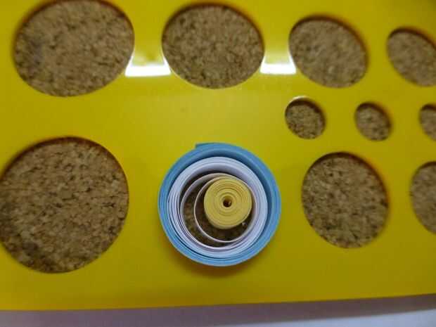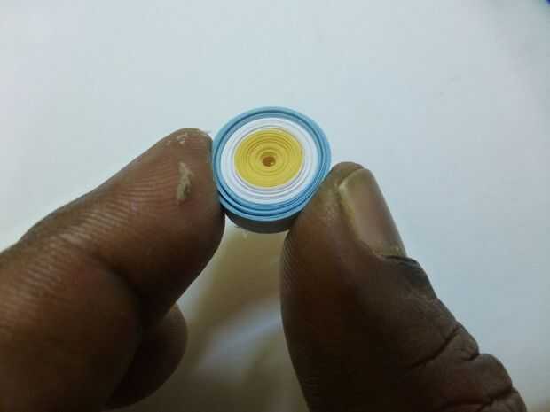 Tienes que iniciar el proyecto quilling de una base. Aquí he utilizado una herida libremente desplazarse varios color como base. He utilizado cintas quilling de colores amarillo, blancos y azules. Se puede utilizar cualquier color de su elección.