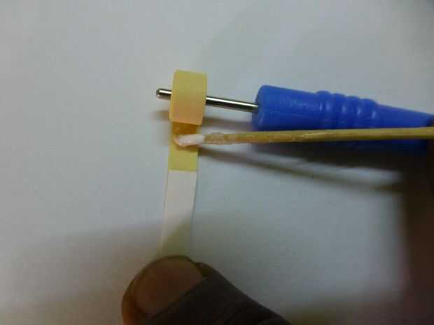 • Aplique una gota de pegamento en el extremo de la cinta amarilla, presione y sostenga junto